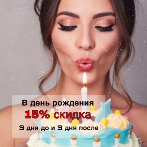 Специальное предложение для замечательных клиентов! Только в ваш день рождения и за 3 дня до и после, вы получаете 15% СКИДКУ на все услуги нашего салона! 💖